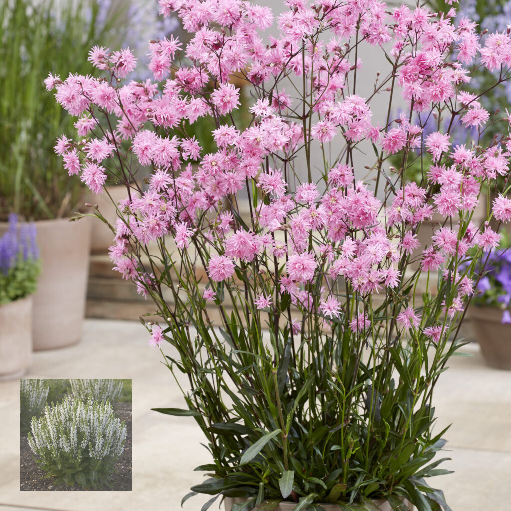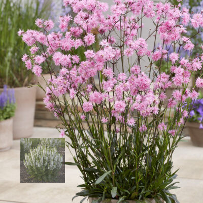 masses of fluffy sugar pink flowers on wiry stems, above mounds of compact dark green foliage