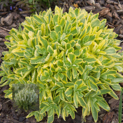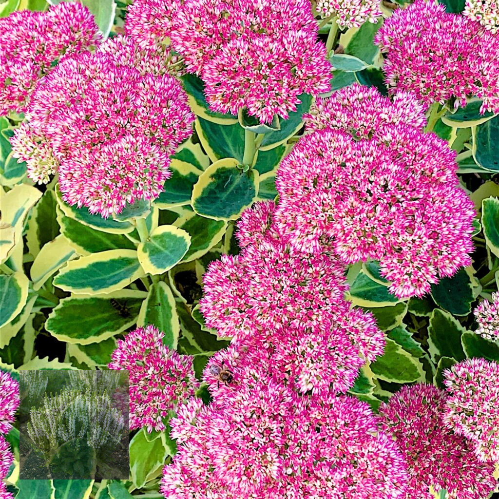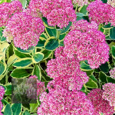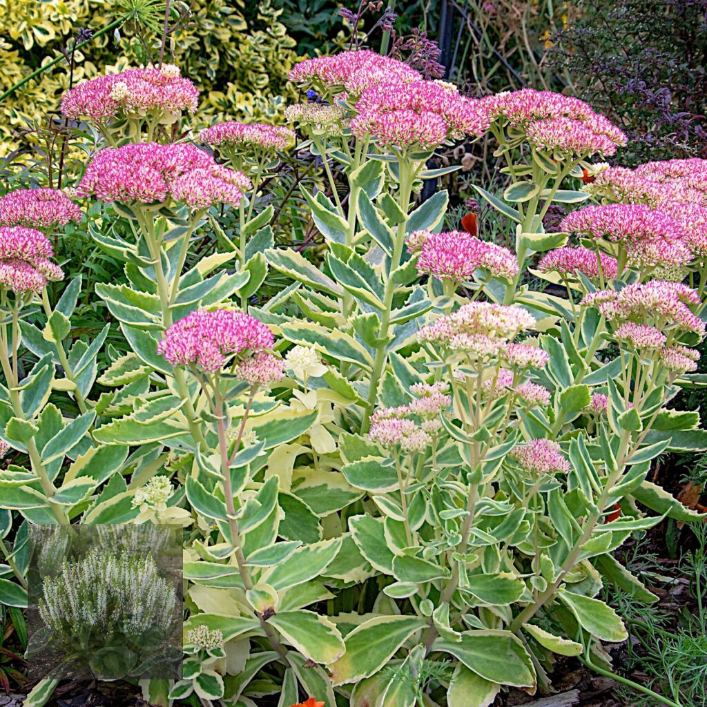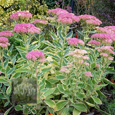 a stunning variety of the well-known Sedum that stands out primarily for its spectacular variegated foliage. In late summer, large, dome-shaped flower heads appear, which change color beautifully from soft pink to a deep rust-red hue in the autumn.